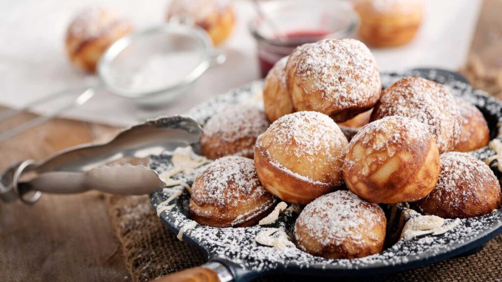 Aebleskiver biasanya dihidangkan dengan serbuk gula dan jem buah-buahan sebagai hidangan penutup yang lazat.